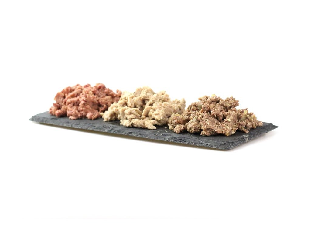 70% (Hovězí srdce, Hovězí maso, Hovězí játra, Hovězí plíce), 28,5% Vývar, 1% Minerály, 0,5% Slunečnicový olej.