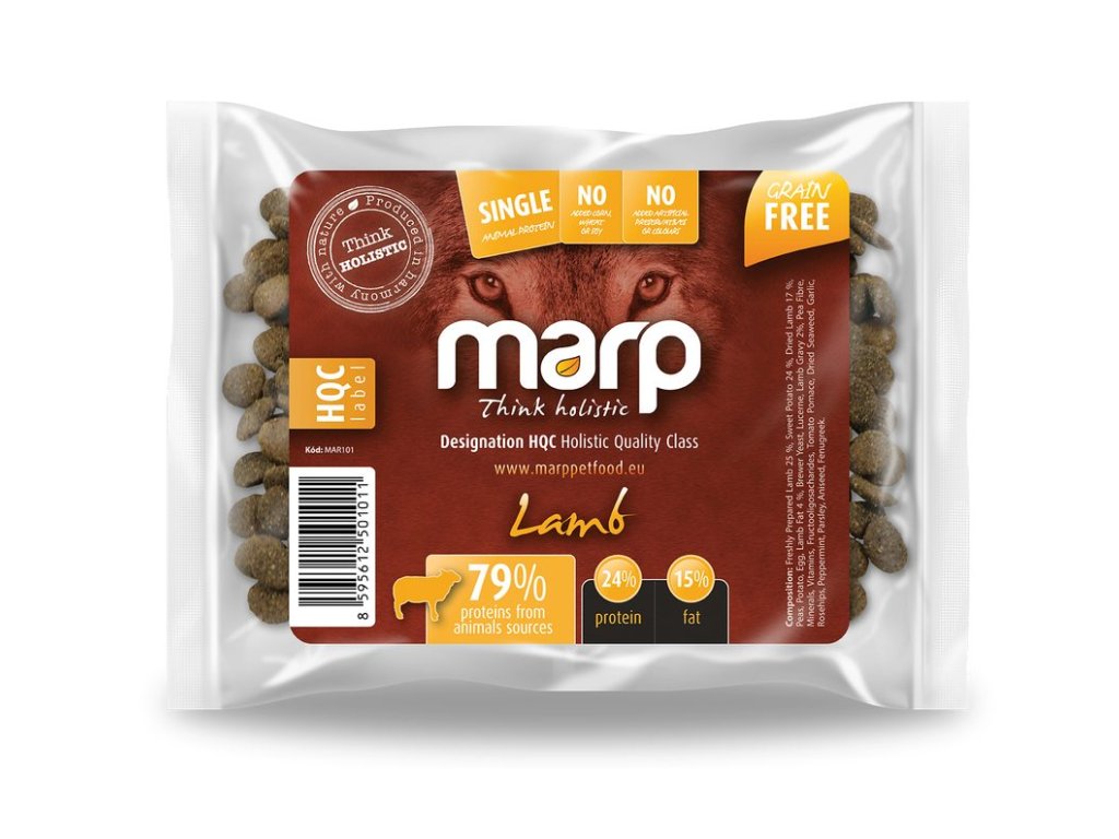 Mezi nejdůležitější vlastnosti krmiva Marp patří kvalita surovin. Klíčové je pro nás využívat lokální dodavatele – tedy místní zemědělce a farmáře. Maso zpravidla pochází ze zvířat z volných chovů. Díky jednomu druhu masa a jednoduchému složení se nám daří vytvářet přírodní krmiva, po kterých psi dobře prospívají. Řada Marp Holistic obsahuje vždy suroviny pouze z jednoho zvířete – čerstvé maso, sušené maso a tuk. Receptura Marp Holistic jehněčí bez obilovin je vhodná pro psy s citlivým zažíváním a dle našich zkušeností je velmi vhodná i pro psy s potravními alergiemi.