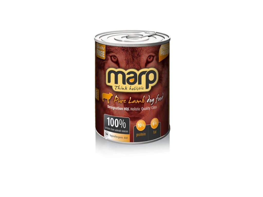 Konzervy Marp Pure obsahují 100% bílkovin ze živočišných zdrojů. Obsahují pouze maso, vnitřnosti, vývar a minerály. Nepoužíváme žádné umělé konzervanty, barviva, plnidla apod a jsou vždy bez jakýchkoliv obilovin. Konzerva Marp s jehněčím bez obilovin je vhodná pro psy s citlivým zažíváním a dle našich zkušeností je velmi vhodná i pro psy s potravními alergiemi.